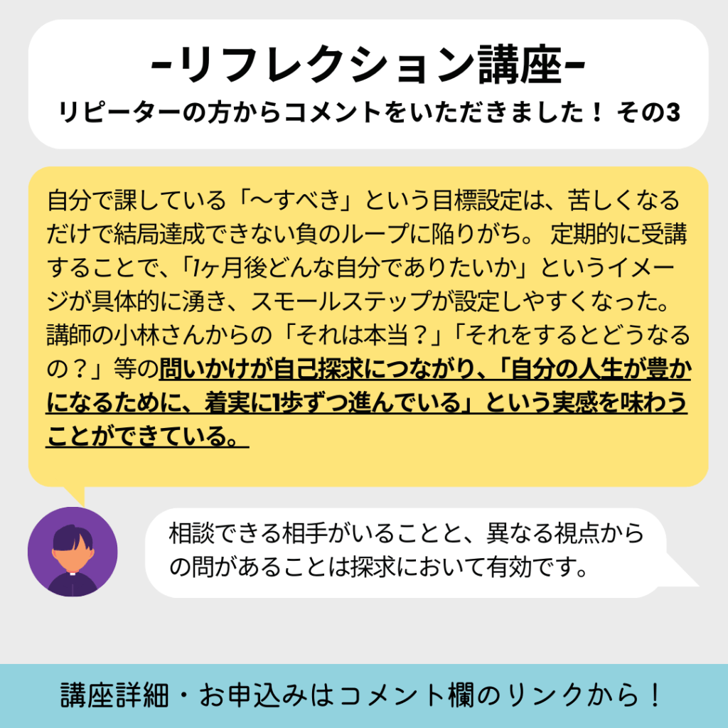 ・自分で課している「~すべき」という目標設定は、苦しくなるだけで結局達成できない負のループに陥りがち。 定期的に受講することで、「1ヶ月後どんな自分でありたいか」というイメージが具体的に湧き、スモールステップが設定しやすくなった。