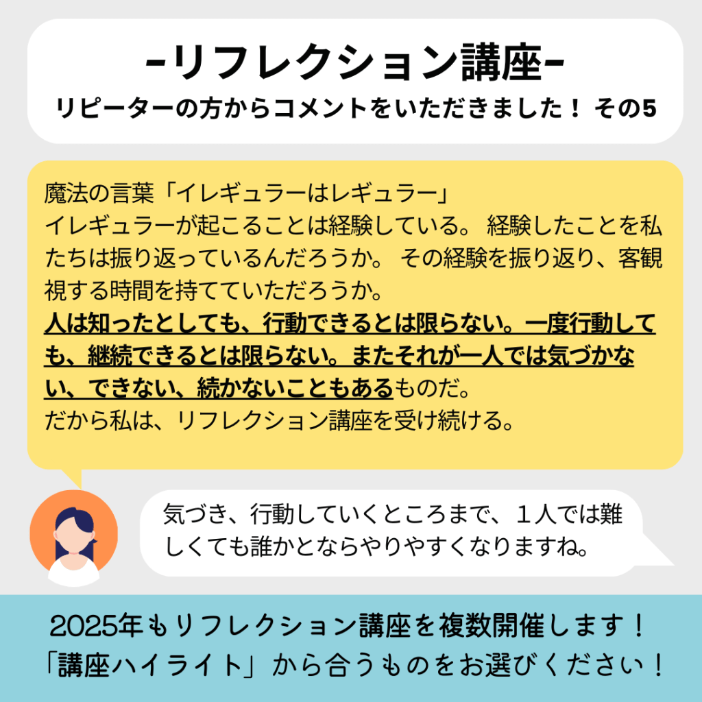 イレギュラーが起こることは経験している。 経験したことを私たちは振り返っているんだろうか。 その経験を振り返り、客観視する時間を持てていただろうか。人は知ったとしても、行動できるとは限らない。一度行動しても、継続できるとは限らない。またそれが一人では気づかない、できない、続かないこともあるものだ。