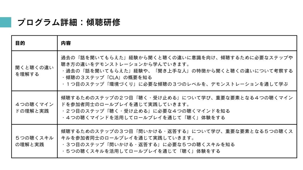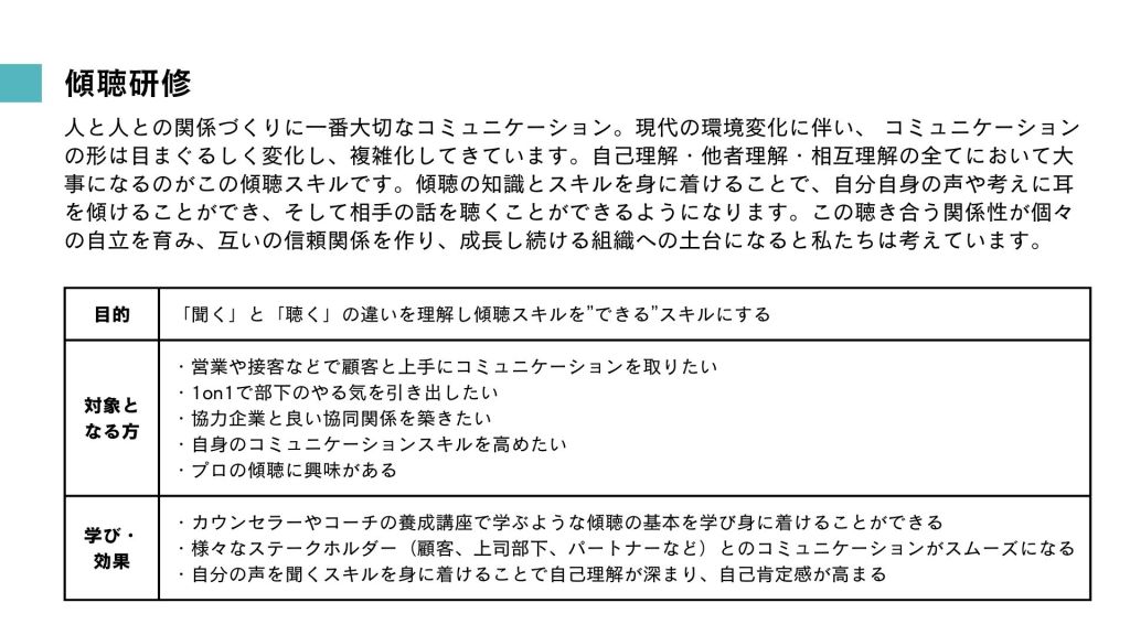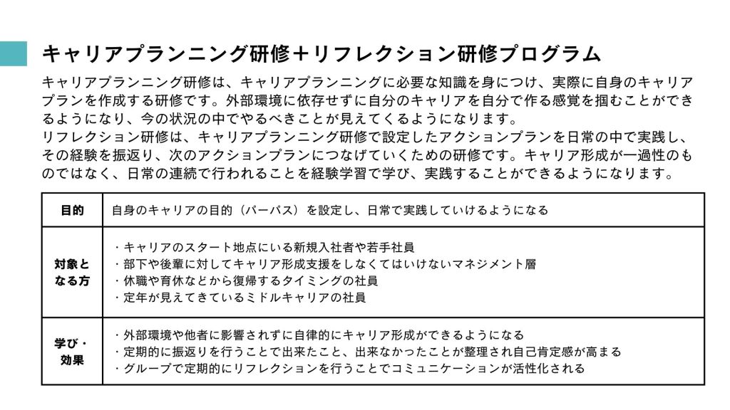 | 若手・中堅社員 | ●振返り(リフレクション)研修 ●キャリアプランニング研修 ●傾聴研修 |