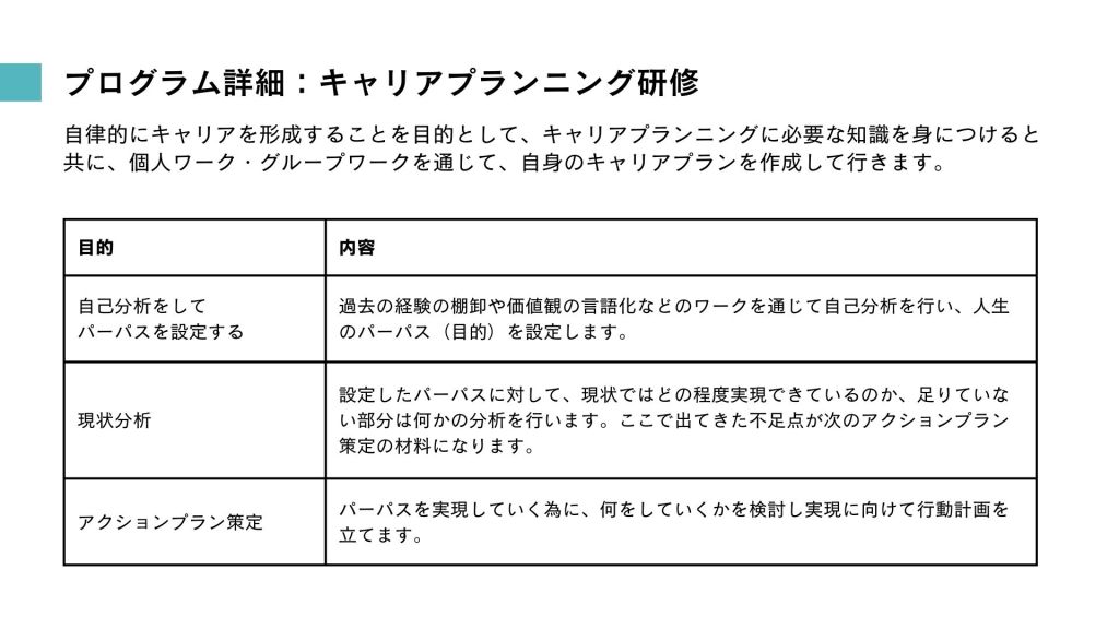 キャリアに関する知識を身に着け、日常や人生に活かせるスキルに変える実践型の研修を行います。