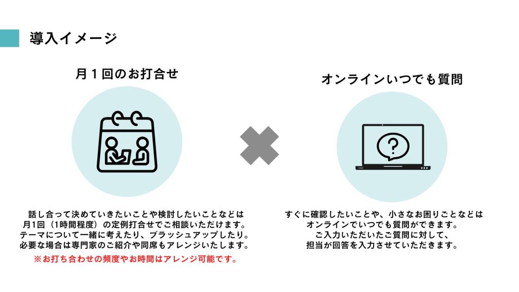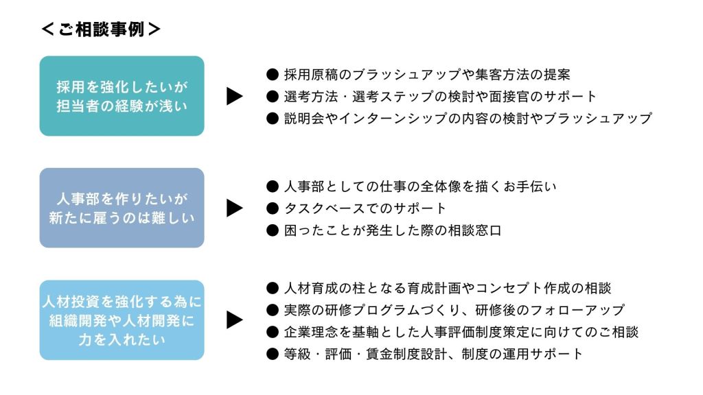 人事の仕事(採用・育成・評価など)の相談をお受けする、人事部が自走できるための伴走支援サービスです。コンサルティングのように課題分析・解決策提案などは行わず、疑問点や課題点のご相談を受け、解決に向けた方策検討を一緒に行う伴走支援型のサービスです。